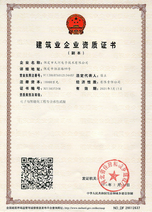 2016年4月,天河電子取得河北省住房和城鄉(xiāng)建設(shè)廳頒發(fā)的建筑智能化工程專(zhuān)業(yè)承包貳級(jí)資質(zhì)。