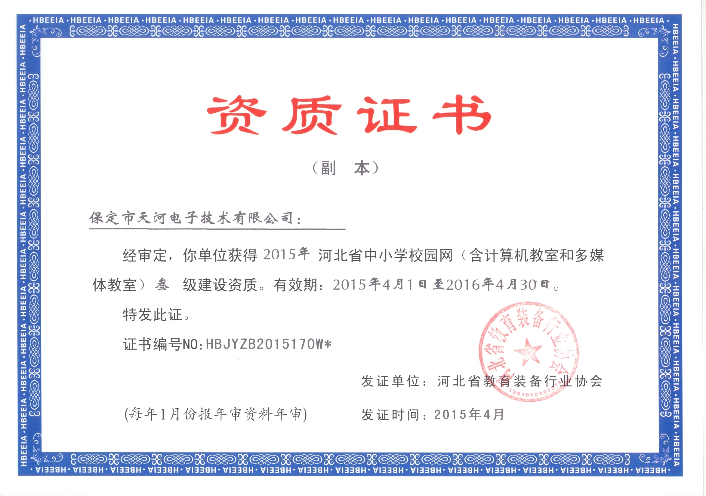 2015年4月我公司獲批河北省中小學(xué)校園網(wǎng)(含計(jì)算機(jī)教室和多媒體教室)叁級(jí)建設(shè)資質(zhì)